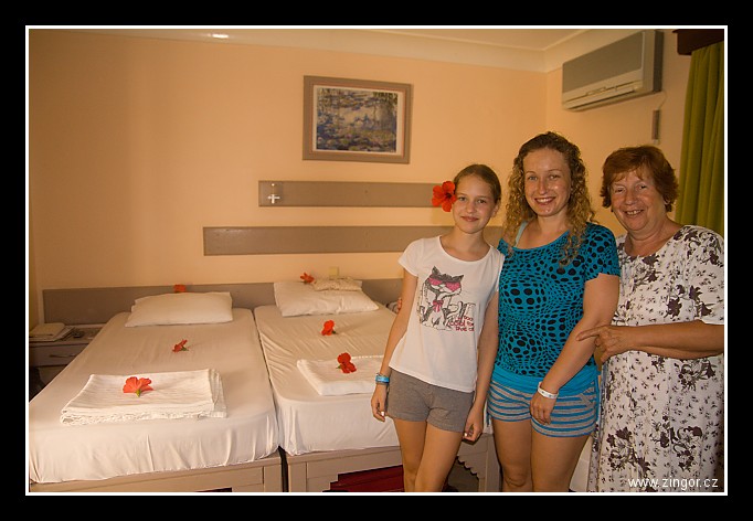 | Holky dávaly podle instrukcí z průvodce uklízečkám tringelta - tak jim naše přidělená uklízečka zdobila pokoj květinami :) |